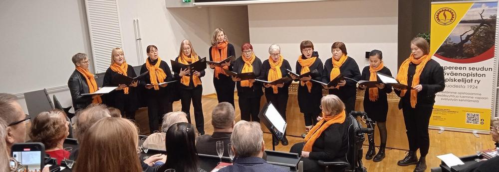 Vasemmalla allekirjoittanut (vas.), Tampereen yhdistyksen pitkäaikainen puheenjohtaja Sirkka-Liisa Jukarainen (kesk.) ja Oikealla Tampereen yhdistyksen sihteeri Milja Nieminen (oik). Sampolan laulajat -kuoro esiintyi opettajansa Sari Anttilan johdolla.